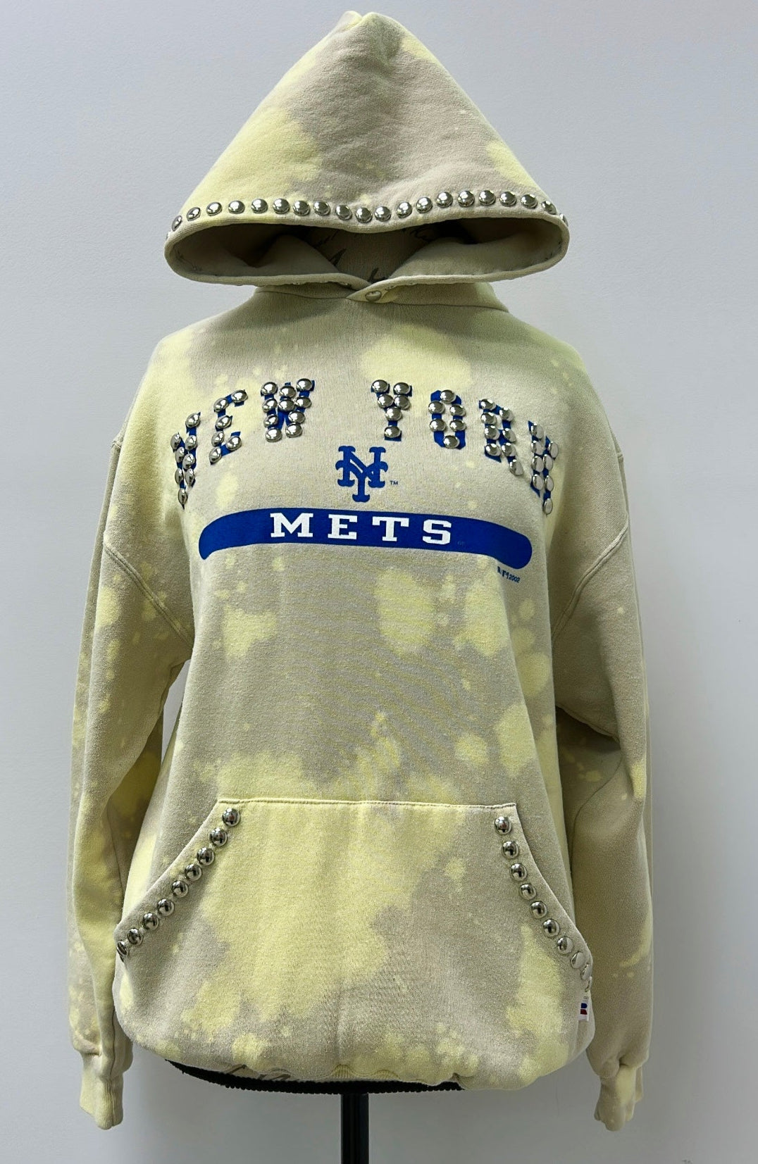 Make a bold statement with our one-of-a-kind New York Mets Reworked sweatshirt. This upcycled piece features hand-applied bleach patterns, heavy distressing, and metal stud detailing by hand that give it a raw, edgy look. The classic graphic is reimagined with a rebellious twist- perfect for anyone who likes their streetwear with attitude and individuality. No two are alike, making your truly personal.